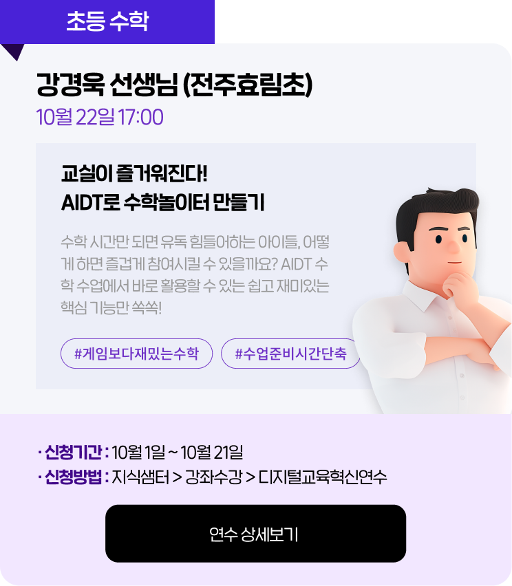 교실이 즐거워진다! AIDT로 수학 놀이터 만들기수학 시간만 되면 유독 힘들어하는 아이들, 어떻게 하면 즐겁게 참여시킬 수 있을까요? AIDT 수학 수업에서 바로 활용할 수 있는 쉽고 재미있는 핵심 기능만 쏙쏙!