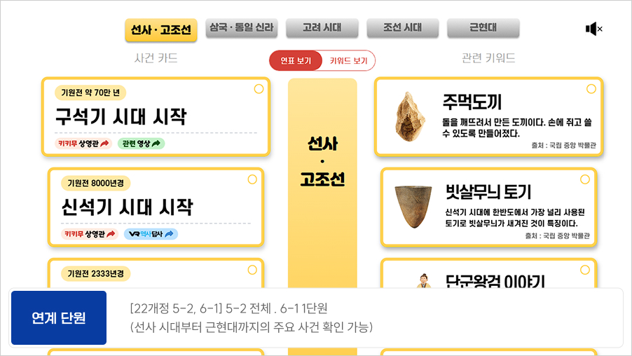 선사부터 근현대까지 시대별 핵심 키워드를 재미있고 풍부한 영상과 실감형 자료,